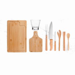 Descrição: Kit conta com tábua para churrasco, tábua para caipirinha, socador, colher 18cm e pegador em Bambu; faca 8″, faca 4″ para frutas e garfo em Bambu/Inox; copo em Vidro. Estão perfeitamente acomodados em uma caixa para presentear.