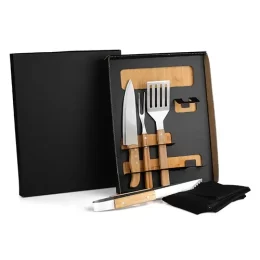 DESCRIÇÃO: Kit para churrasco/hambúrguer pegador e espátula. Conta com tábua em Bambu; Faca 8” e garfo em Bambu/Inox; pegador e espátula perfurado em aço Inox/Madeira; Avental em Brim preto.