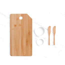 Kit para Petisco contendo tábua com furo e duas espátulas 14cm em Bambu; dois ramekins, um pequeno e um mini em Porcelana. Estão perfeitamente acomodados em uma caixa para presentear. Produtos confeccionados em Bambu: Utilizamos o Bambu, por ser uma matéria prima ecológica, autossustentável e com alta resistência.