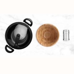 Descrição: Kit para pipoca Conta com panela pipoqueira em Inox antiaderente; pote para tempero em Inox; cumbuca em Bambu. (Acompanha tampa para usar a panela como espagueteira).