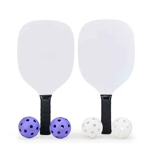 Descrição: Kit Pickleball com duas raquetes de madeira (sendo uma face personalizada e outra lisa) com grip composto em fibras de carbono e vidro e quatro bolas plástica com 26 furos. Acompanha bolsa de nylon com alça de mão e visor plástico transparente.