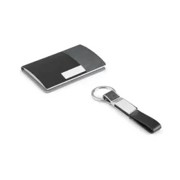 Kit Porta Cartões e Chaveiro de Metal e Couro Sintético.Em caixa almofadada. Chaveiro: 15 x 92 x 8 mm | Porta cartões: 97 x 65 x 11 mm | Caixa: 154 x 143 x 34 mm