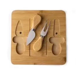 Descrição: Kit queijo 3 peças, contém: tábua de bambu com canaleta, faca com ponta, garfo e espátula. Tábua com imã para encaixe e fixação dos utensílios.