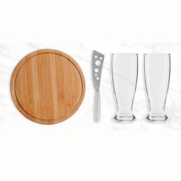 Descrição: Kit para Queijo e Cerveja Conta com tábua para queijo/petisco; faca para frios em Metal; dois copos para cerveja em Vidro. Estão perfeitamente acomodados em uma caixa para presentear.
