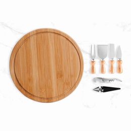 Descrição: Kit para Queijo e Vinho com tábua para queijo/petisco; duas facas, sendo, uma com ponta e outra reta, garfo e espátula em Bambu/Inox; abridor e tampão em Metal; espaço para garrafa com palha. NÃO ACOMPANHA GARRAFA. Estão perfeitamente acomodados em uma caixa para presentear.