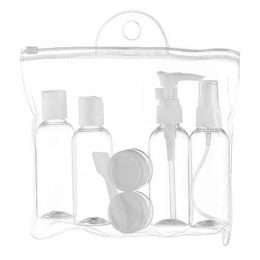 Descrição: Kit viagem 7 peças em estojo plástico ziplock. Contém 2 frascos 80ml com tampa flip-top, frasco 80ml com tampa spray, frasco 80ml com tampa pump, 2 potes com tampa de 10ml e mini espátula.