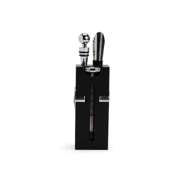 Descrição: Kit vinho com seis peças em inox dispostas em um suporte organizador em MDF. O conjunto contém: tampa de bico, bico condutor com tampa, termômetro, saca-rolhas metálico com lâmina de corte e abridor de garrafa e dois wine collars.