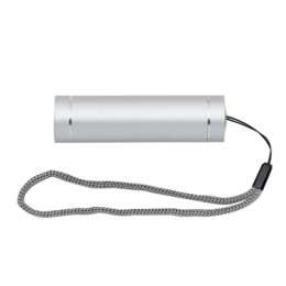 Lanterna bastão alumínio com led. Tampa de rosca lado oposto ao Led, possui acionador emborrachado em relevo e acompanha cordão. Possui anel prata em cada extremidade da peça, para utilizar basta colocar 3 pilhas AAA (não acompanha).
