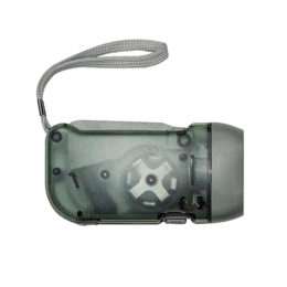 Lanterna plástica com 3 leds, pressionando o “gatilho” gera energia para alimentar a lanterna dínamo. Possui botão para ligar/desligar lanterna, botão para travar gatilho e acompanha cordão.