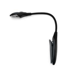 Luminária plástica para leitura. Parte emborrachada articulável, possui botão liga/desliga no verso da lanterna e base com prendedor. Acompanha duas baterias Lithium CR1220 3V.