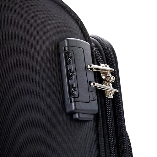Descrição: Mala de bordo 47 Litros com padrão ANAC (Agência Nacional de Aviação Civil), confeccionada em poliéster de alta qualidade, com cadeado numérico TSA. Possui etiquetas de identificação embutidas na mala, sendo uma integrada ao cadeado e outra na parte de trás da mala, acoplada por estojo em couro sintético. Três compartimentos, bolso telado, cinta compressora para roupas, alça de mão em poliéster, puxador retrátil com regulagem de tamanho e quatro rodinhas 360º.
