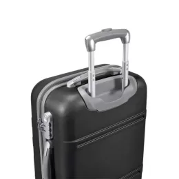 Mala de Viagem Executivo. ABS. Interior forrado, com divisória. 4 rodas giratórias. Pega extensível em alumínio, com mola (altura da pega estendida: 435 mm). Fecho de segurança com senha. Chapa metálica removível para fácil gravação. 350 x 590 x 200 mm | Chapa: 60 x 15 mm