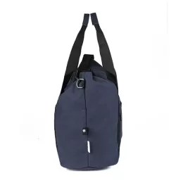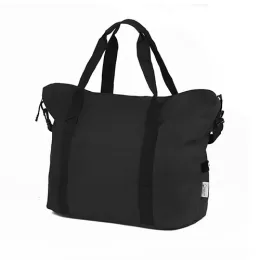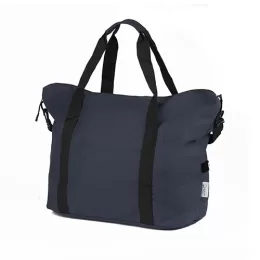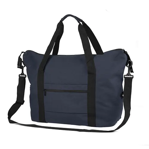 Mala esportiva em algodão reciclado 340 g/m2 e interior em poliéster 210D, bolso com zíper frontal, alça de mão e alça de ombro regulável.