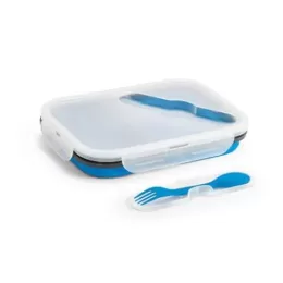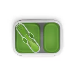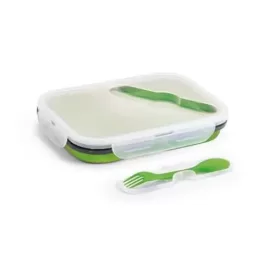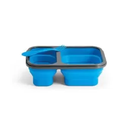 Marmita retrátil. Silicone e PP. Com 2 compartimentos e talher 2 em 1 (garfo e colher). Capacidade: 480 ml + 760 ml. Food grade. 212 x 153 x 73 mm | Dobrada: 212 x 153 x 38 mm
