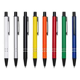 Mini caneta semi metal colorida com detalhes preto. Possui clip metálico e dois anéis prata na parte inferior. Aciona por clique.