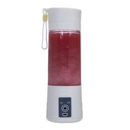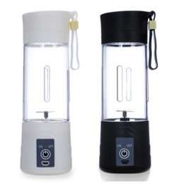 Mini liquidificador de plástico resistente com hélice de aço inoxidável, totalmente desmontável. Possui coador, alça emborrachada para transporte e botão liga/desliga. Motor DC3-6V, corrente 1,0 – 1,2A, bateria 3,7V, capacidade 2000mAh. Acompanha cabo USB para carga, tempo estimado de 3 horas.