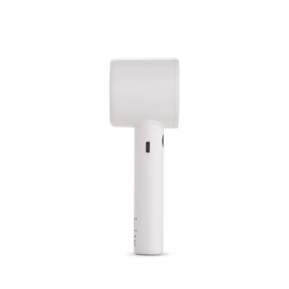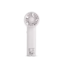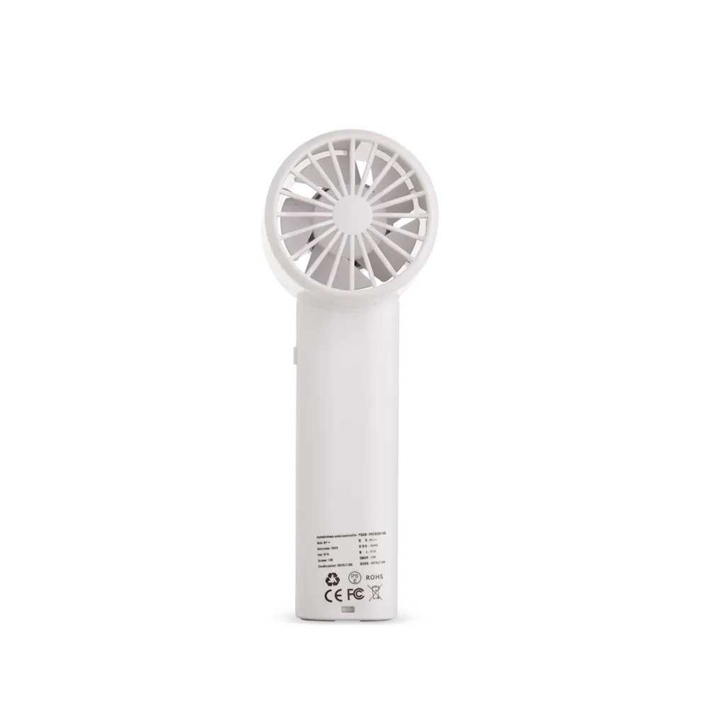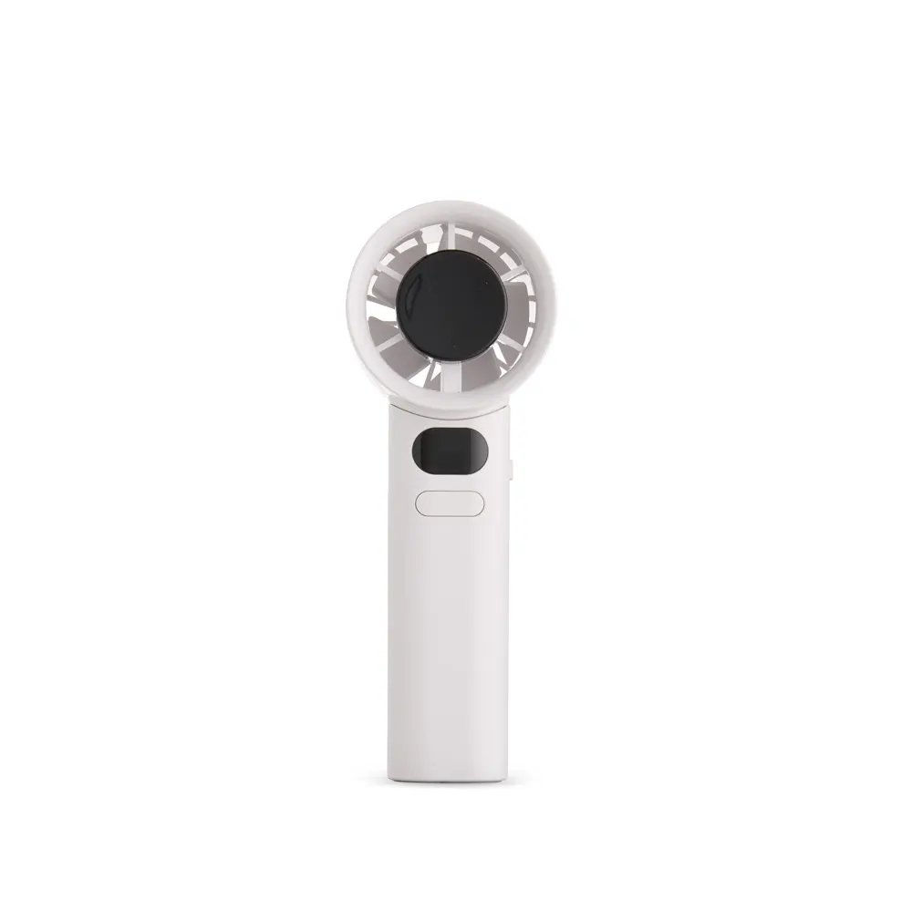Mini ventilador recarregável em plástico e metal. Possui controle de velocidade ajustado por botões frontais, acionamento por chave seletora e painel de LED que exibe níveis de velocidade e carga da bateria. Acompanha cabo USB-C e cordão em nylon.