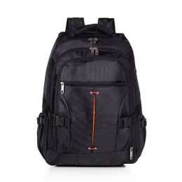 Descrição: Mochila de nylon com rodinhas. Possui alça de mão, puxador retrátil com regulagem e botão acionador, alças para costa escondidas no compartimento traseiro com zíper, compartimento mediano com duas divisórias teladas, compartimento mediano também com abertura frontal, possui detalhes laranja e bolsos laterais. O compartimento principal possui bolso para notebook até 15.6 polegadas, forro com zíper. A parte interna conta com um sistema organizatório através de alças de nylon ajustáveis, quando utilizadas impedem que as roupas se movimentem dentro da mochila enquanto à transporta. Possui duas rodinhas e freios em plástico, além de um sistema velcro para junção do compartimento das alças com a parte inferior, tampando as rodinhas enquanto transporta a mochila na costa. Acompanha plaquinha metálica para personalização.