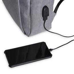 Descrição: Mochila confeccionada em nylon com compartimento para notebook até 15,6 polegadas. Contém compartimento grande com divisórias para documentos, eletrônicos e caneta, compartimento mediano com abertura vertical, compartimento frontal, bolso lateral e adaptador USB externo com cabo acoplado, permitindo a conexão de um carregador portátil de dentro da mochila e transferência da carga para o lado externo, ocultando o carregador e viabilizando a utilização do celular durante o processo. Contém zíperes com pegadores plásticos, alça de mão em nylon e alças para as costas ajustáveis com revestimento espumado antitranspirante.