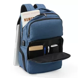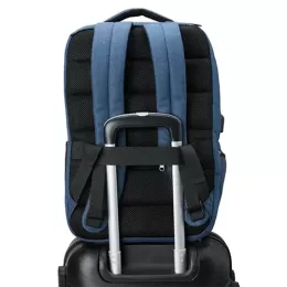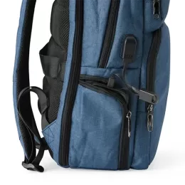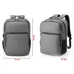 Descrição: Mochila de nylon resistente à água, com capacidade de 29 litros com 6 compartimentos, sendo o principal com bolso para notebook de 15,6 polegadas e um compartimento com abertura lateral para armazenar documentos. Contém divisórias internas para acessórios e porta-chaves. A mochila possui adaptador USB externo, bolso antifurto nas costas, bolso na lateral com elástico, engate para malas de viagem, área costada com revestimento espumado e alças com bolsos integrados para cartões ou moedas.