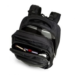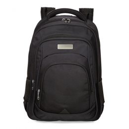 Descrição: Mochila de alta confecção em poliéster com detalhes em nylon. Com amplo espaço, possui compartimento grande com bolso para notebook, compartimento mediano com divisórias para documentos, canetas, eletrônicos e entre outros; compartimento frontal e bolsos laterais em malha. Contém duas alças de mãos, sendo uma de nylon e outra com acabamento de poliéster revestido com espuma, trazendo mais eficácia no transporte de bagagens pesadas. Alças para costas com possibilidade de ajuste: superior, peitoral e inferior, proporcionando um maior conforto e correta distribuição do volume transportado. Contém zíperes prata, detalhe triangular emborrachado na área frontal inferior, parte traseira com revestimento anti-transpirante e alça horizontal para encaixe em malas de viagem. Acompanha plaquinha metálica para personalização.