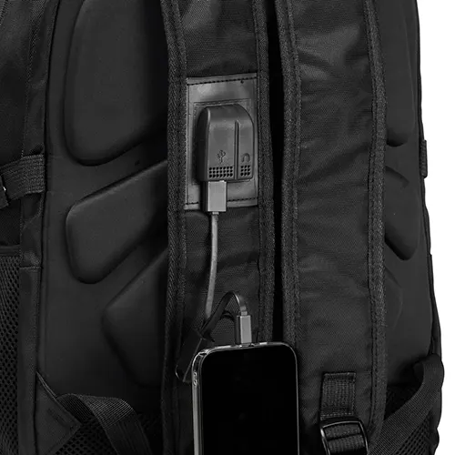 Descrição: Mochila confeccionada em PVC Jacquard com mescla em seda, resistente à água, fechamento em zíper no compartimento principal e capacidade de até 23 litros. Possui uma placa metálica para personalização, três compartimentos frontais, dois bolsos laterais em tela de nylon e bolso traseiro para notebook de até 15,3 polegadas. Conta ainda com engates laterais ajustáveis, alça superior em plástico e silicone, alças acolchoadas, adaptadores USB e P2 e painel traseiro estofado. Acompanha capa protetora em tecido sintético.