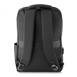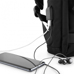 Mochila p/ Notebook, tecido poliéster, bolso central com porta notebook, mais três bolsos interno porta tablet, celular e carteira, bolso frontal com aberturar lateral, um mini bolso externo na lateral, alça de ombro e mão, toda forrada, cabo USB e áudio interno com conector externo na lateral.