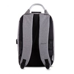 Uma mochila moderna com bastante espaço interno incluindo porta notebook, possui fechamento em cadeado com segredo. Alça de mão em metal, fita reflexiva, um bolso frontal grande. Divisórias internas para canetas, documentos e telefone celular. Alça almofadada. Saída USB e fone de ouvido. Tecido em poliéster.