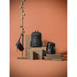Mochila para notebook em 300D e 600D, ambos em poliéster reciclado (100% rPET) com elementos refletores. Possui 1 compartimento principal com 1 bolso multifuncional e bolso para notebook portátil até 15.6″. Bolso frontal com zíper, 2 bolsos laterais em tela mesh e um elástico na frente para transporte de diferentes objetos. A parte posterior e alças são almofadadas. Capacidade até 18 L. 320 x 450 x 140 mm