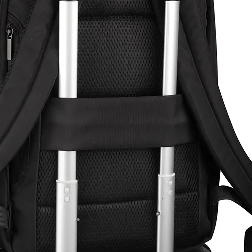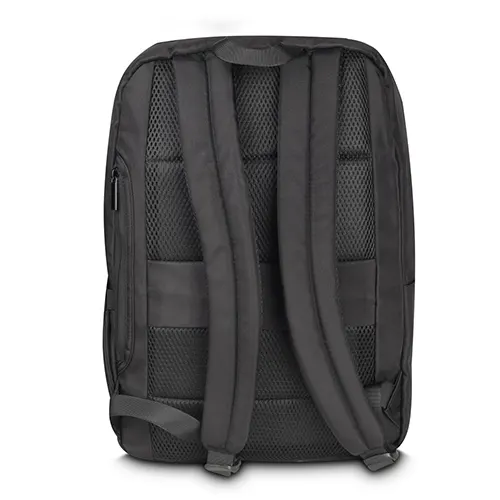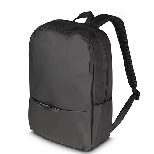 Mochila para notebook em tecido poliéster 600D e detalhe em PU, compartimento interno para notebook de até 15,6″, engate para mala de viagem, dois bolsos laterais e bolso frontal com zíper.