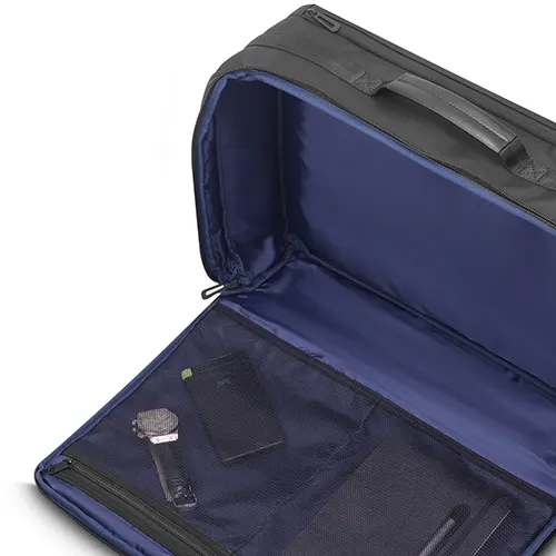 Mochila/Pasta premium, produzida em poliéster 600D acolchoado e interior em 210D, divisória com ampla abertura para acomodar vestuário e outros pertences, alças de ombro acolchoadas,alça na lateral para locomoção, interior com divisórias com zíper para acomodar pequenos objetos, engate para mala de viagem, aceita notebook de até 15,6”.