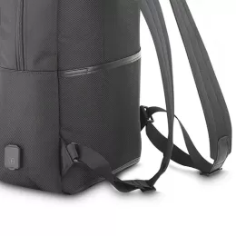 Mochila premium, produzida com poliéster 600D acolchoado e interior em 290T, alças de ombro acolchoadas, tecido impermeável, bolso frontal com zíper,divisória interna para canetas e pequenos objetos, aceita notebook de até 15,6”, porta USB na lateral, com engate para mala de viagem.