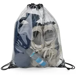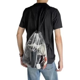 Mochila Saco em PVC transparente com detalhes em tecido nylon, alças reguláveis e dois ilhós metálicos.