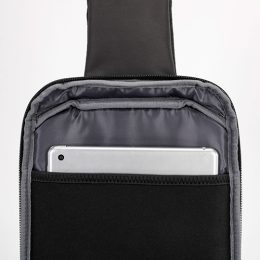 Mochila transversal com bolso interno para guardar seus itens essenciais, feito de tecido de poliéster, alça de ombro esquerdo/ombro direito reversível. Compartimento interno acolchoado para tablet, porta USB na parte inferior frontal.