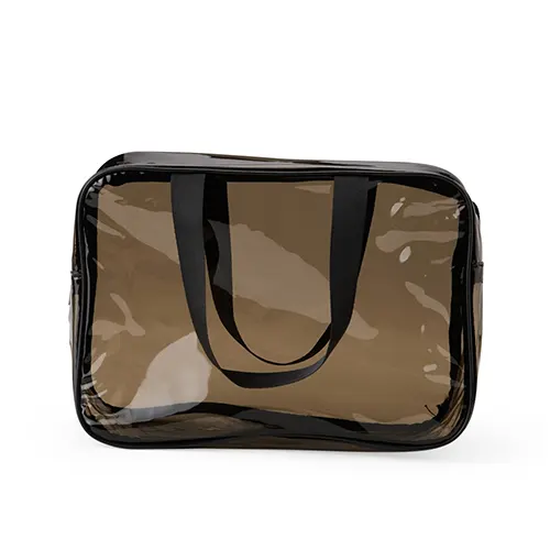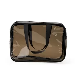 Descrição: Nécessaire de PVC e PU resistente à água, com duas alças laterais de mão.