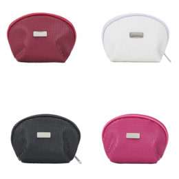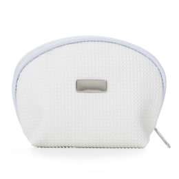 Necessaire em couro sintético texturizado com uma placa central para personalização. Parte interna revestida com cetim.
