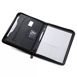 Pasta A4 em Couro Sintético e Microfibra. Bloco: 20 folhas pautadas. Esferográfica não inclusa. 245 x 325 x 40 mm | Chapa: 16 x 45 mm