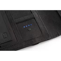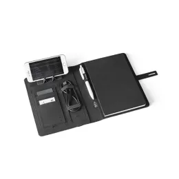 Pasta A5 em 300D rPET com carregador wireless embutido. A bateria tem capacidade para 5.000 mAh, potência de 10W, entrada/saída 5V/2.1A e cabo USB tipo C para carregar a bateria. A pasta contém no seu interior um bolso para smartphone até 6.5”, três espaços para cartões, quatro luzes LED, botão on/off, suportes para esferográfica (não incluída), celular e cabo USB, um bloco de notas com capa em cartão preto e 64 folhas pautadas de cor marfim, em papel proveniente de gestão florestal sustentável. Na frente existe ainda uma impressão oval em preto para indicar a área de carga do wireless. Fornecido em caixa presente. 165 x 225 x 25 mm