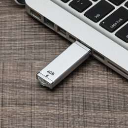 Pen drive Super Talent 4GB em plástico resistente, copo cinza com detalhes prata. Possui tampa e ao conectar no USB uma luz irá acender na parte inferior.
