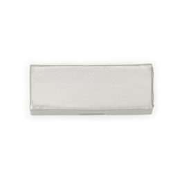 Porta batom em couro sintético prata com plaquinha de metal frontal com botão para abrir/fechar, possui um espelho interno.