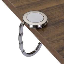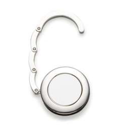 Porta bolsa de metal dobrável, possui chapa central redonda para gravação e parte traseira borracha anti deslizante. Para utilizar o porta bolsa basta puxar a lateral(é imantado) e abri-lo.