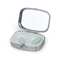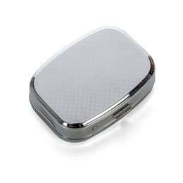 Descrição: Porta comprimido de metal, parte superior(tampa) brilhante externo e interno e lado inferior com detalhes estilo mosaico. Parte interna com duas divisórias plásticas.