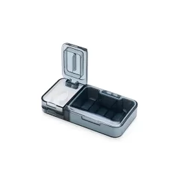 Descrição: Um porta comprimidos multifuncional sob medida para as necessidades diárias de uma rotina de medicação. Feita em plástico, conta com três compartimentos principais, um com três divisórias com capacidade aproximada de 10 ml cada. As outras duas repartições, por sua vez, apresentam um cortador de comprimidos na parte superior e um triturador localizado na interior, ambos com acionamento manual prático e rápido. Seu tamanho compacto garante praticidade para levar o porta comprimidos para qualquer lugar. Acompanha uma pinça com ponta de escova para a limpeza.