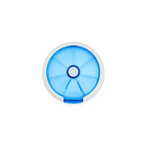 Descrição: Um porta-comprimidos em plástico com design compacto. Possui sete divisórias e um botão de acionamento que gira um compartimento a cada clique, permitindo o acesso ao conteúdo por meio de uma abertura lateral.