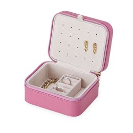 Descrição: Porta joias de couro sintético com revestimento aveludado. Possui compartimentos internos para anéis, brincos, pulseiras e colares.