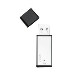 Descrição: Pen drive retangular 4GB, material em metal e detalhes preto em plástico. Possui dois “furos” na parte inferior que poderá ser utilizado para colocar algum cordão(quando conectado uma luz vermelha acende neste local).