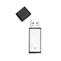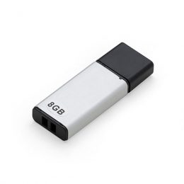 Descrição: Pen drive retangular 8GB, material em metal e detalhes preto em plástico. Possui dois “furos” na parte inferior que poderá ser utilizado para colocar algum cordão(quando conectado uma luz vermelha acende neste local).