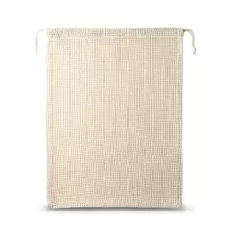 Sacola 100% algodão (120 g/m²) com malha 100% algodão na parte frontal (100 g/m²) e cordões em algodão para fechar. Sacola ideal para levar alimentos. 300 x 400 mm