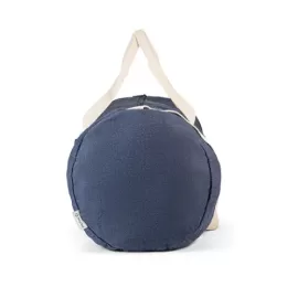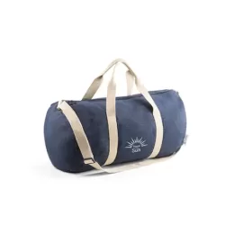 Sacola esportiva ou viagem em denim reciclado (270 g/m²). Contém bolso frontal, fecho duplo e costuras reforçadas. Possui alças em webbing de algodão e alça de ombro ajustável até 130cm. Ø260 x 480 mm