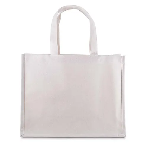 Sacola em Algodão Cru 220g/m², com base plana para maior estabilidade. Alça com altura de 17 cm, ideal para transporte.